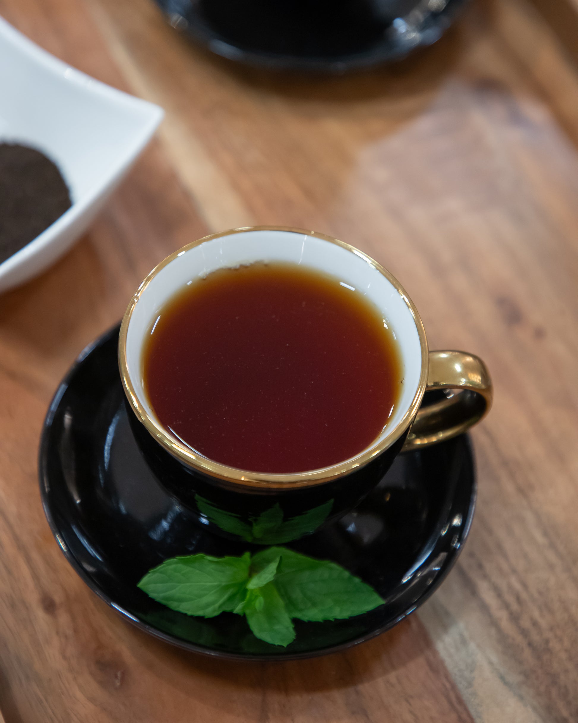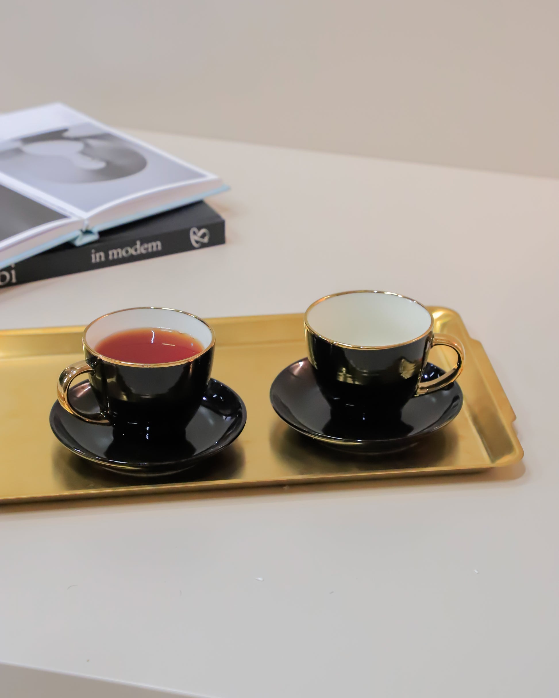طقم فناجين شاي أسود بمقبض ذهبي مع صحن