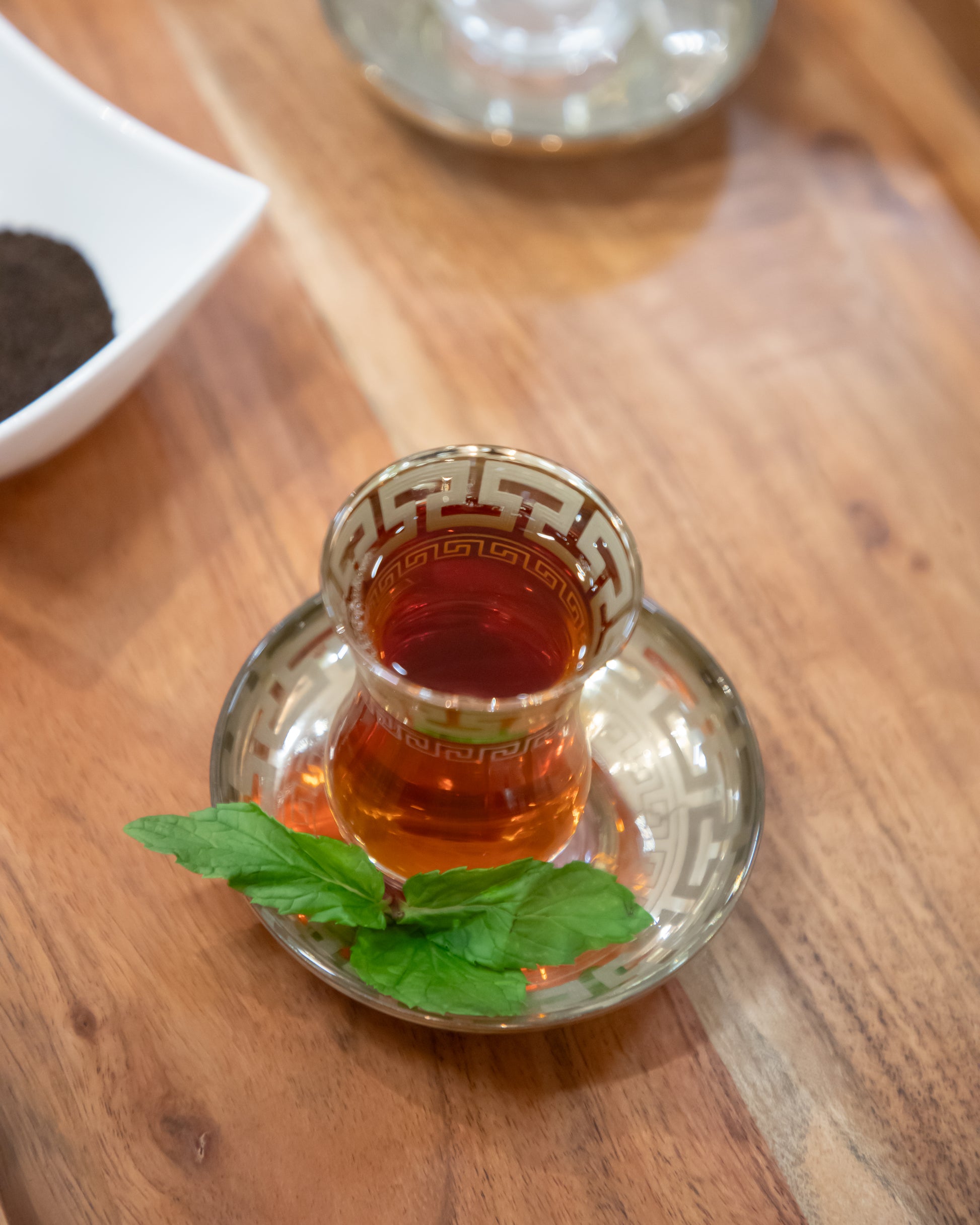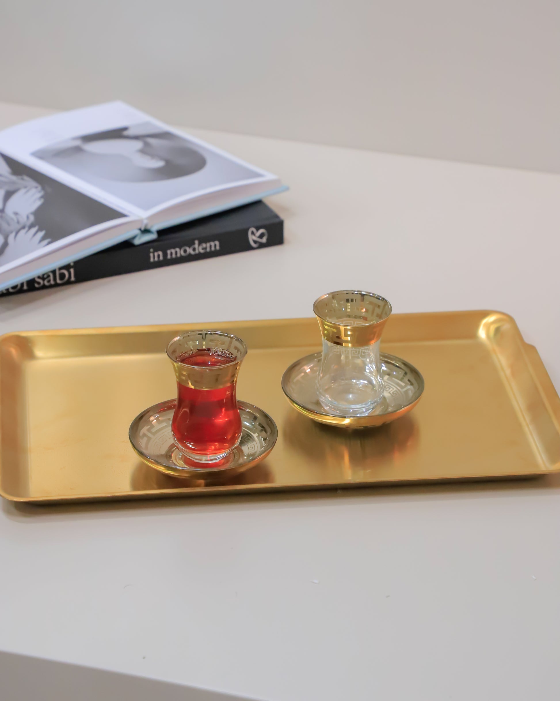 طقم كاسات شاي شفاف مع صحن بتصميم أنيق باطار ذهبي