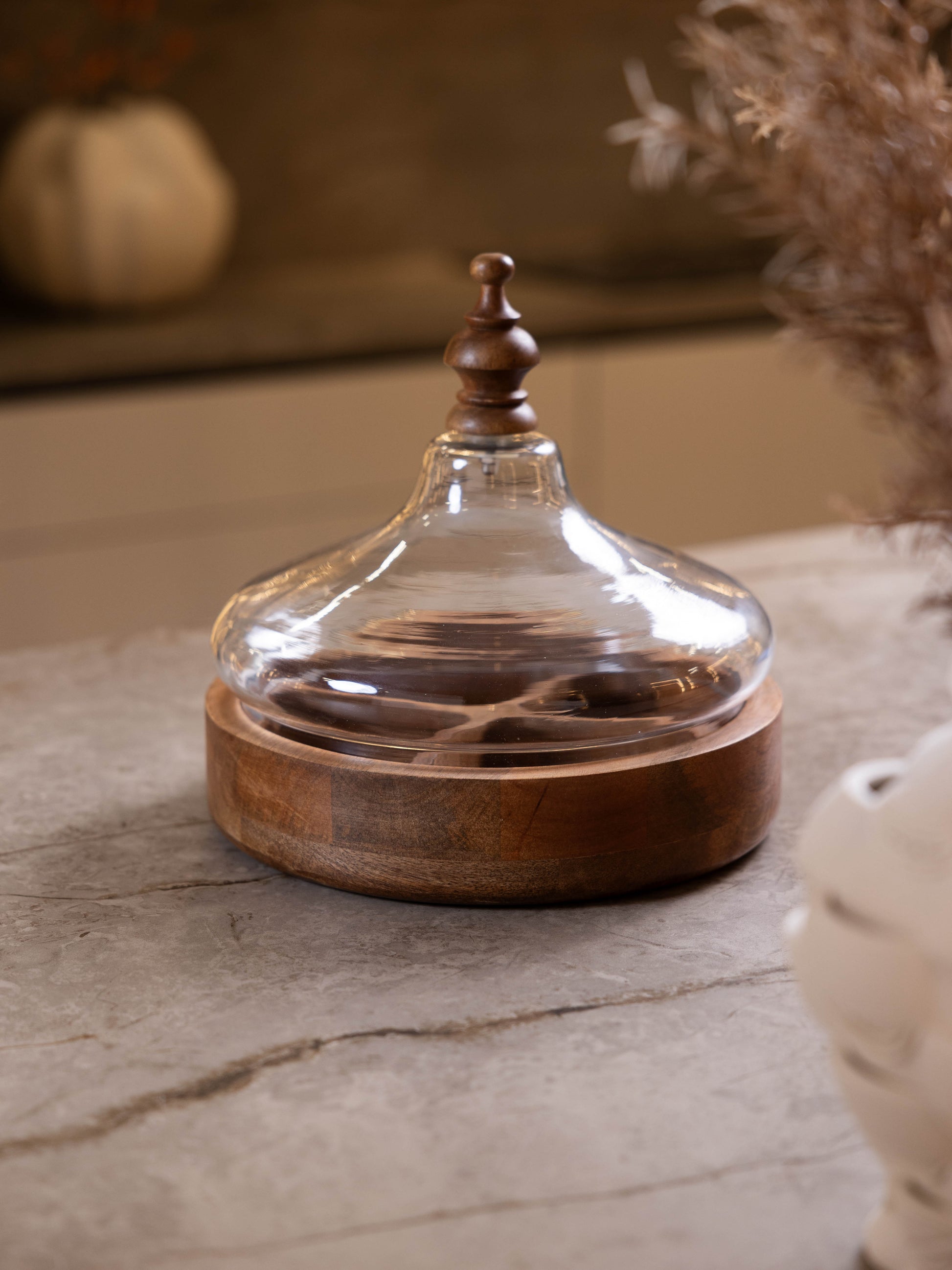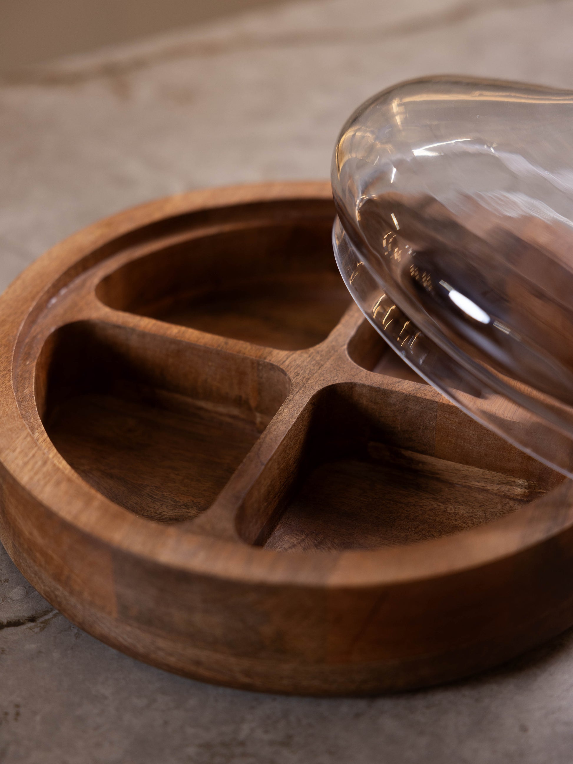 مضيفة حلويات بغطاء زجاجي وقاعدة خشبية بأربع أقسام