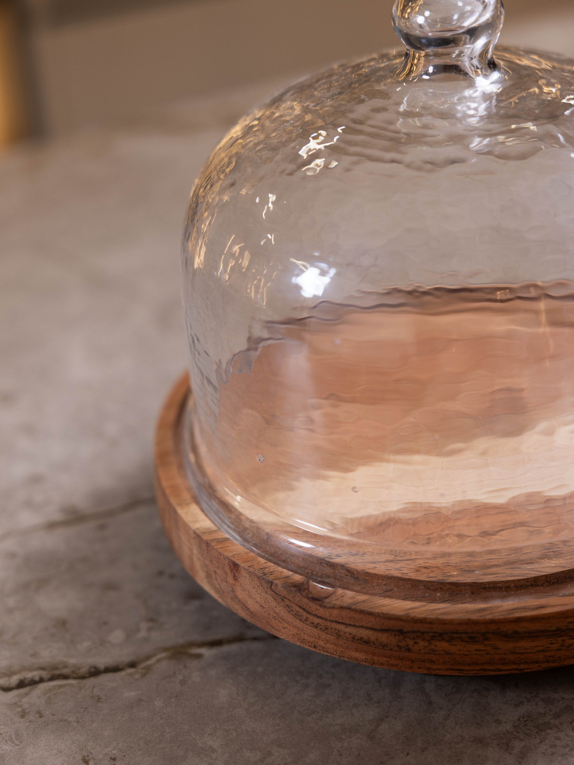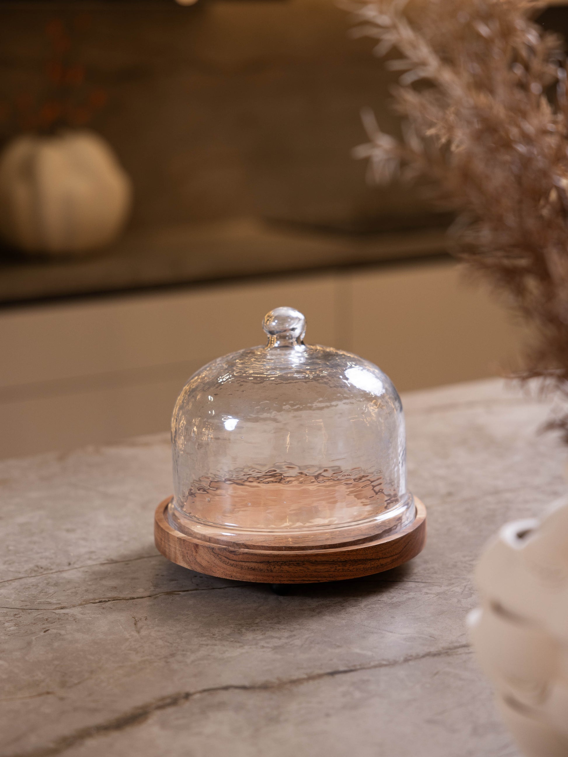 مضيفة كيك بغطاء زجاجي وقاعدة خشبية
