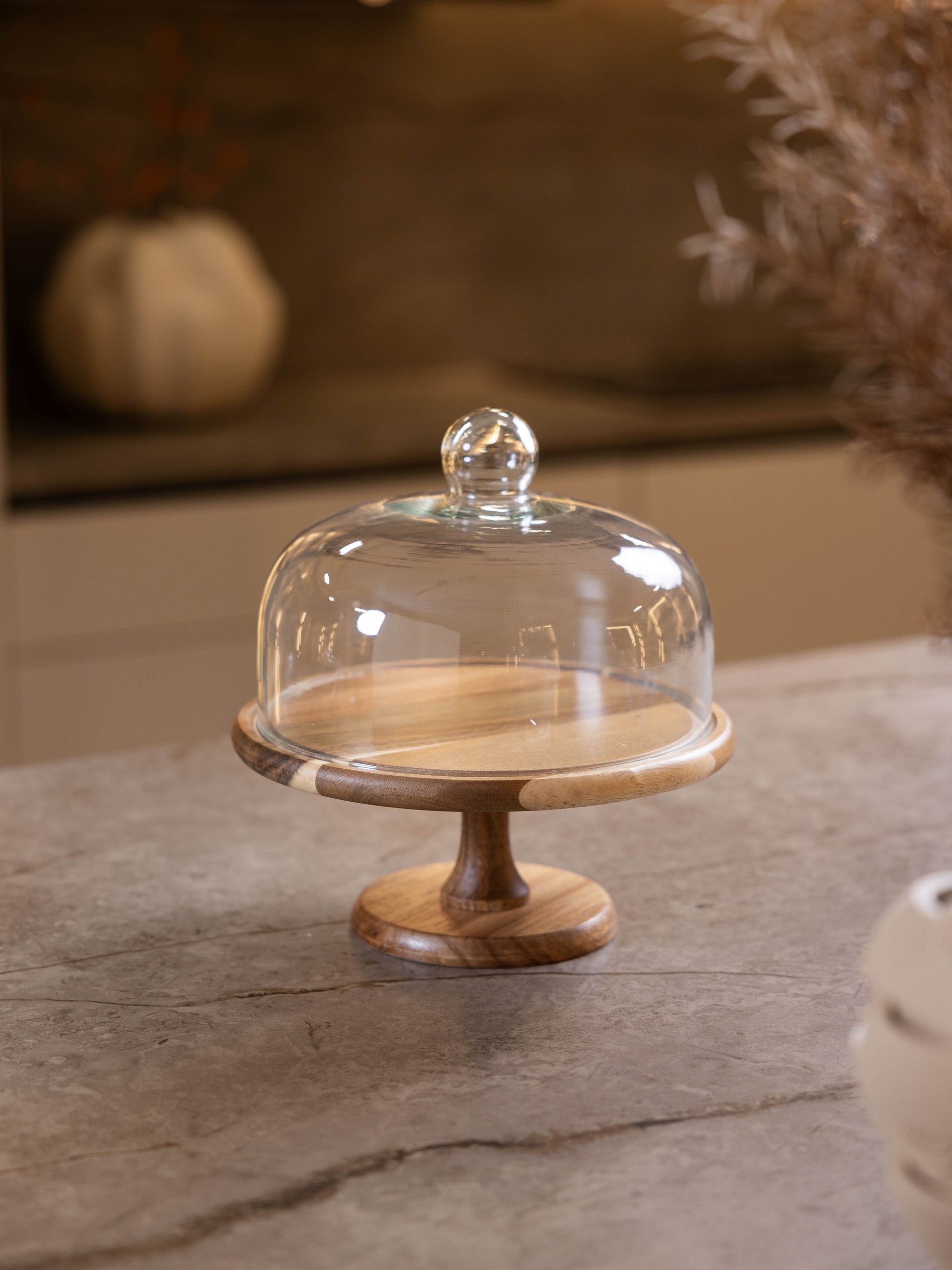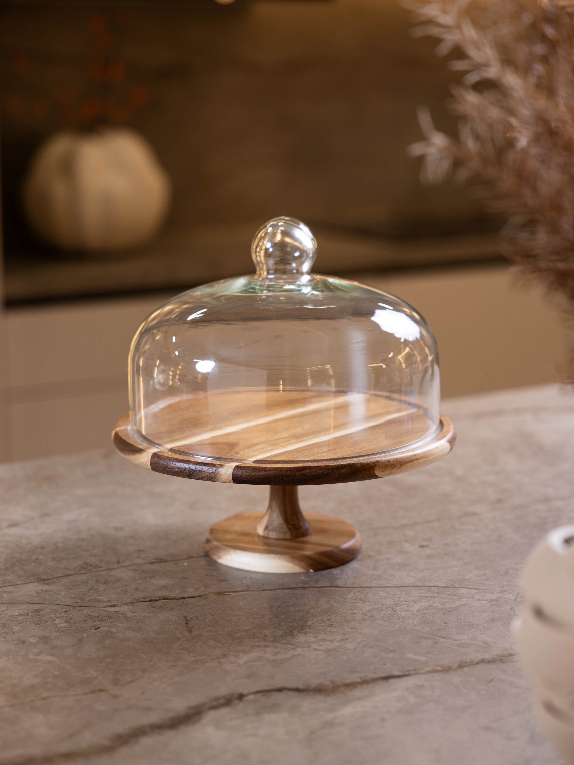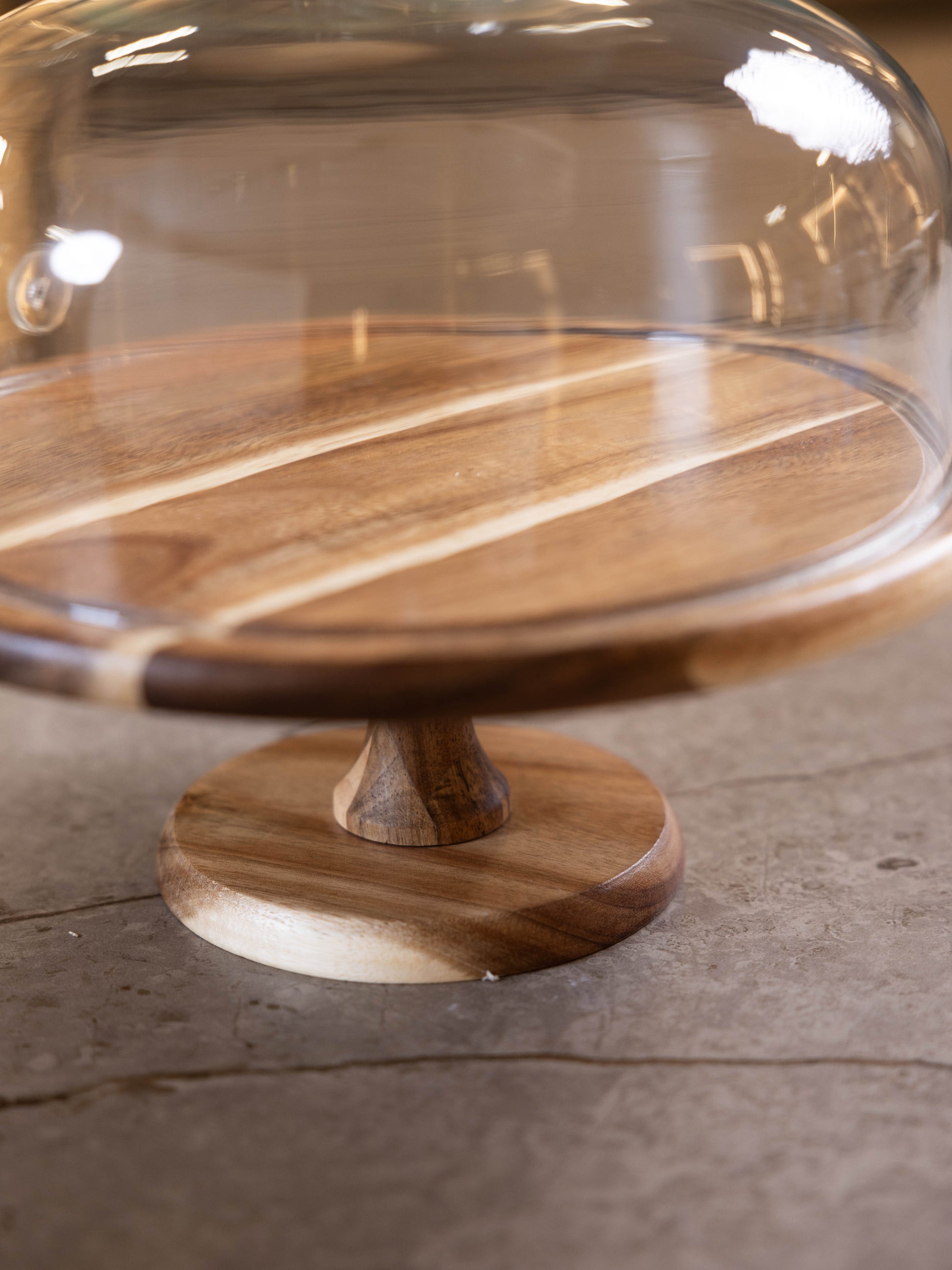 مضيفة كيك بغطاء زجاجي وقاعدة خشبية