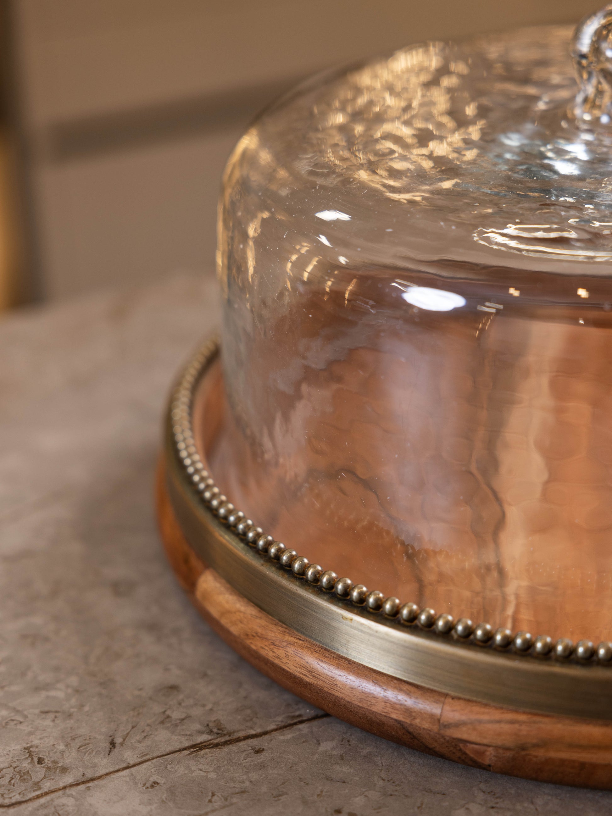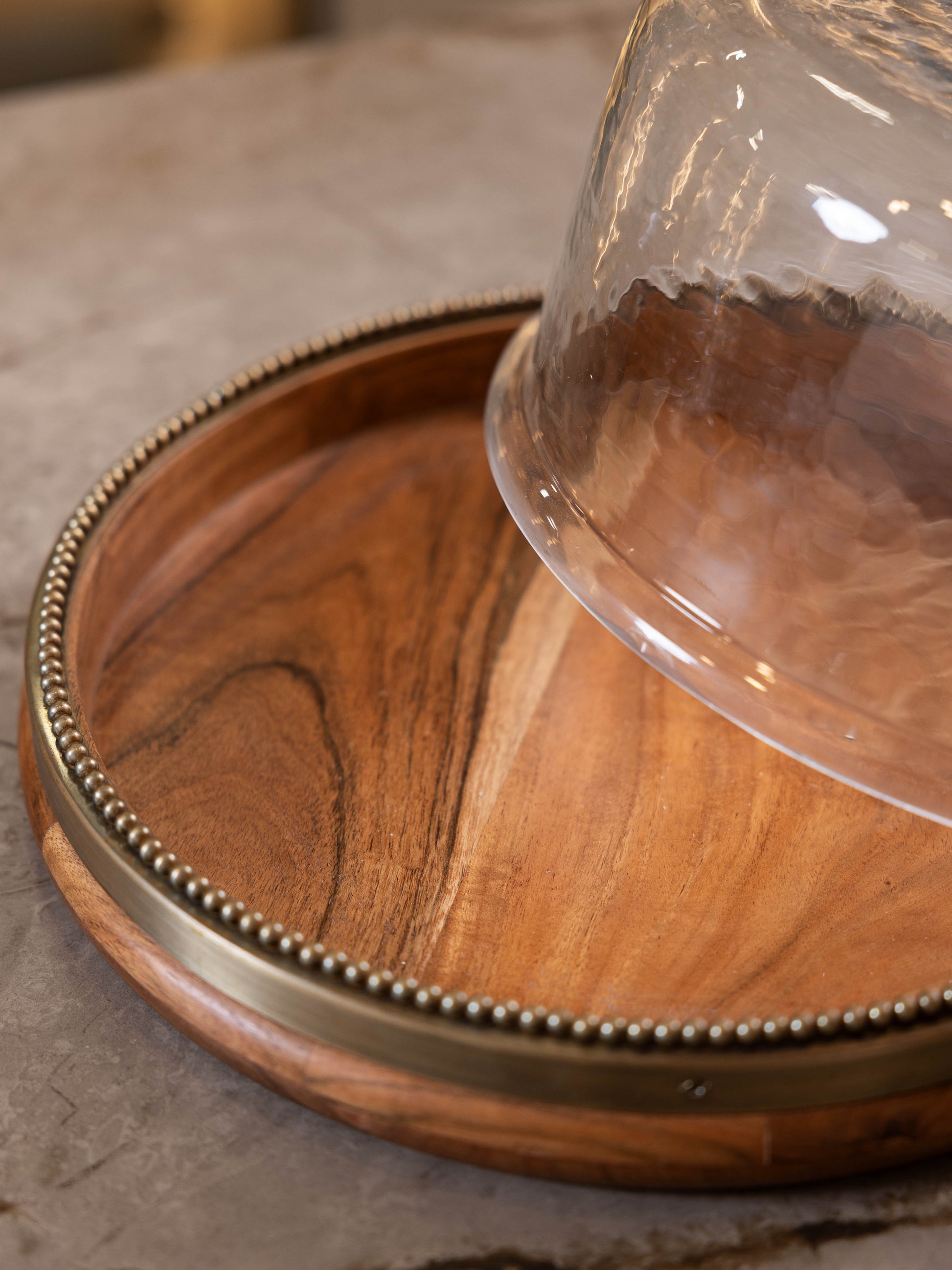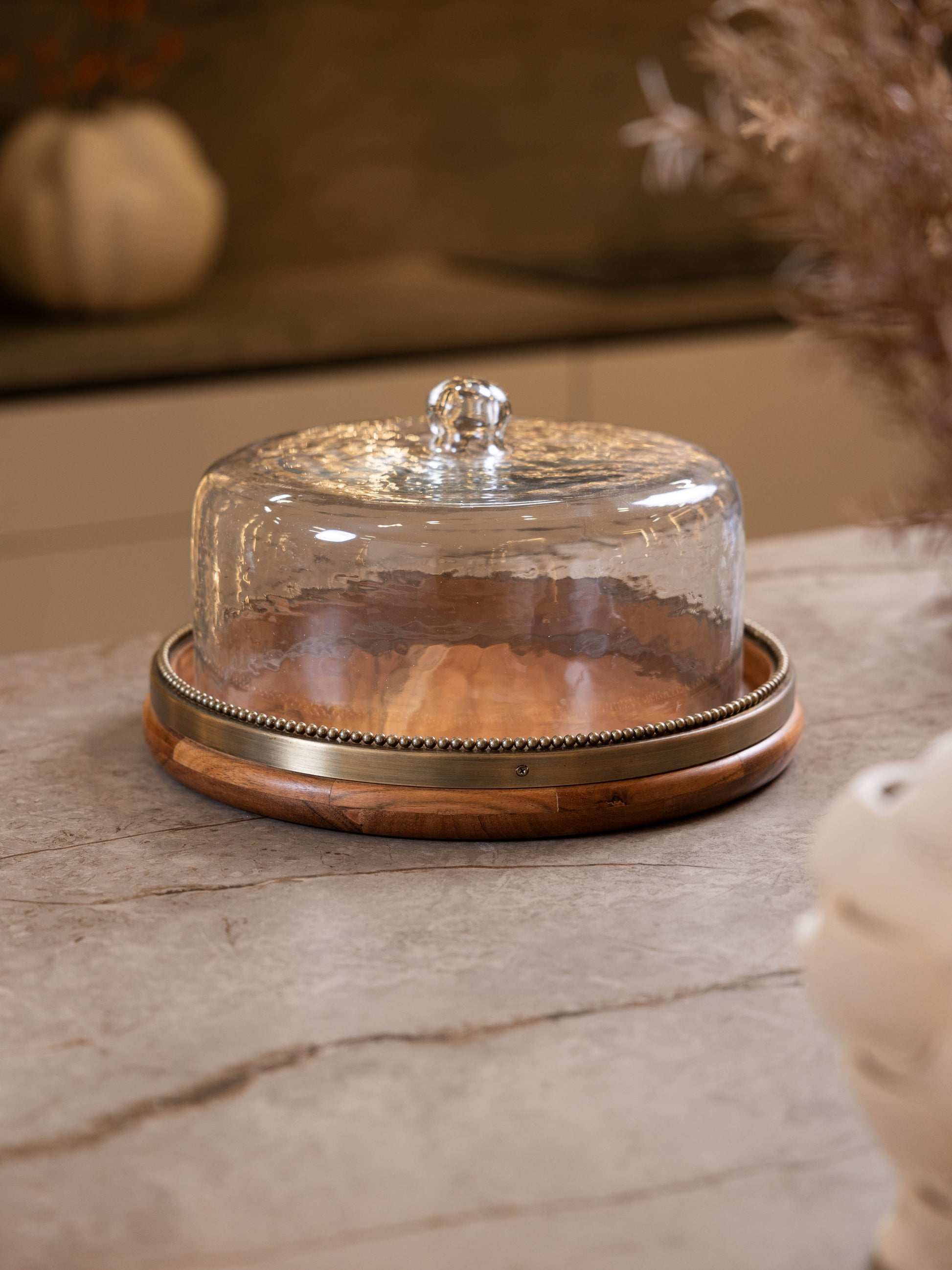 مضيفة كيك بغطاء زجاجي وقاعدة خشبية