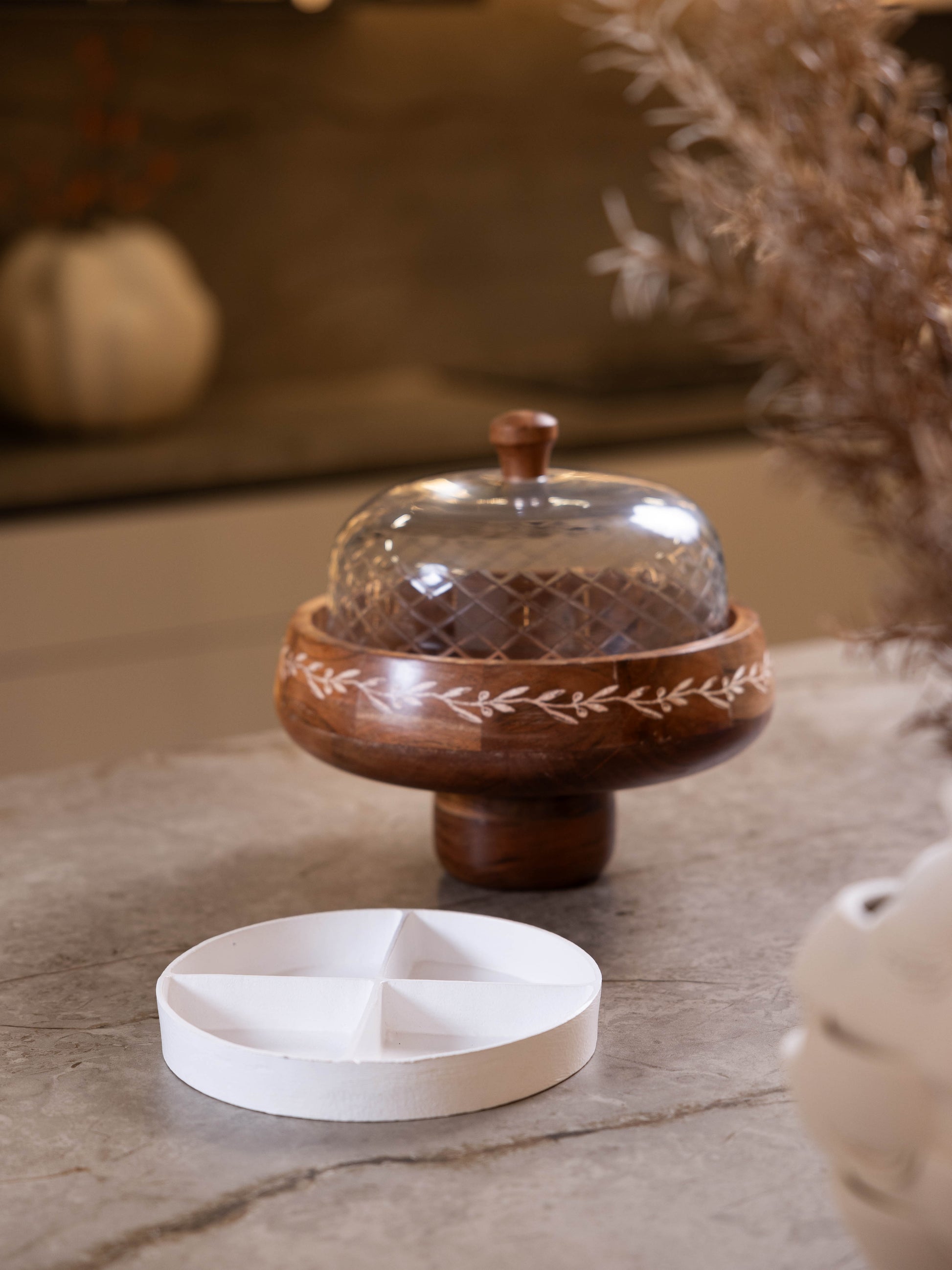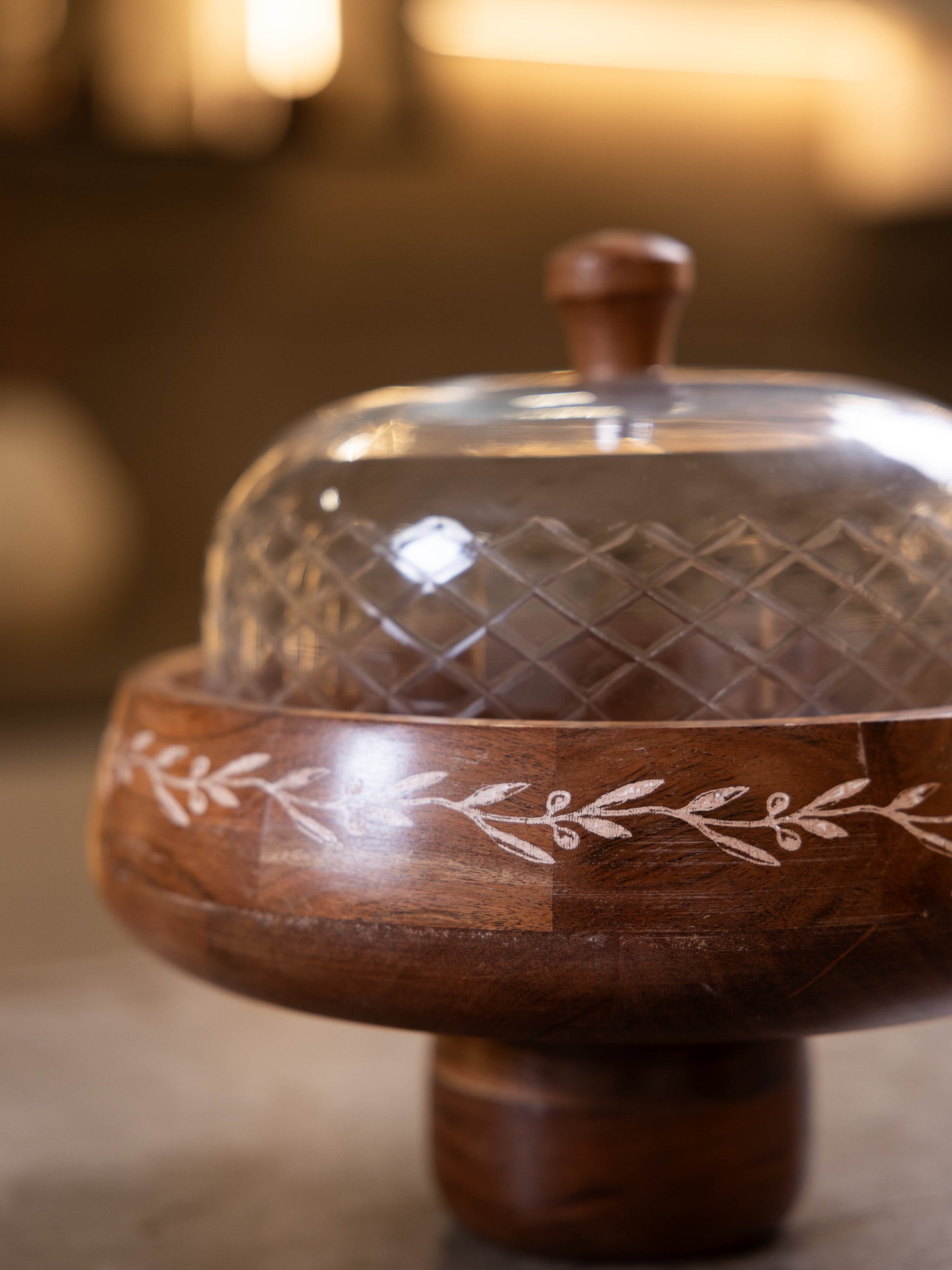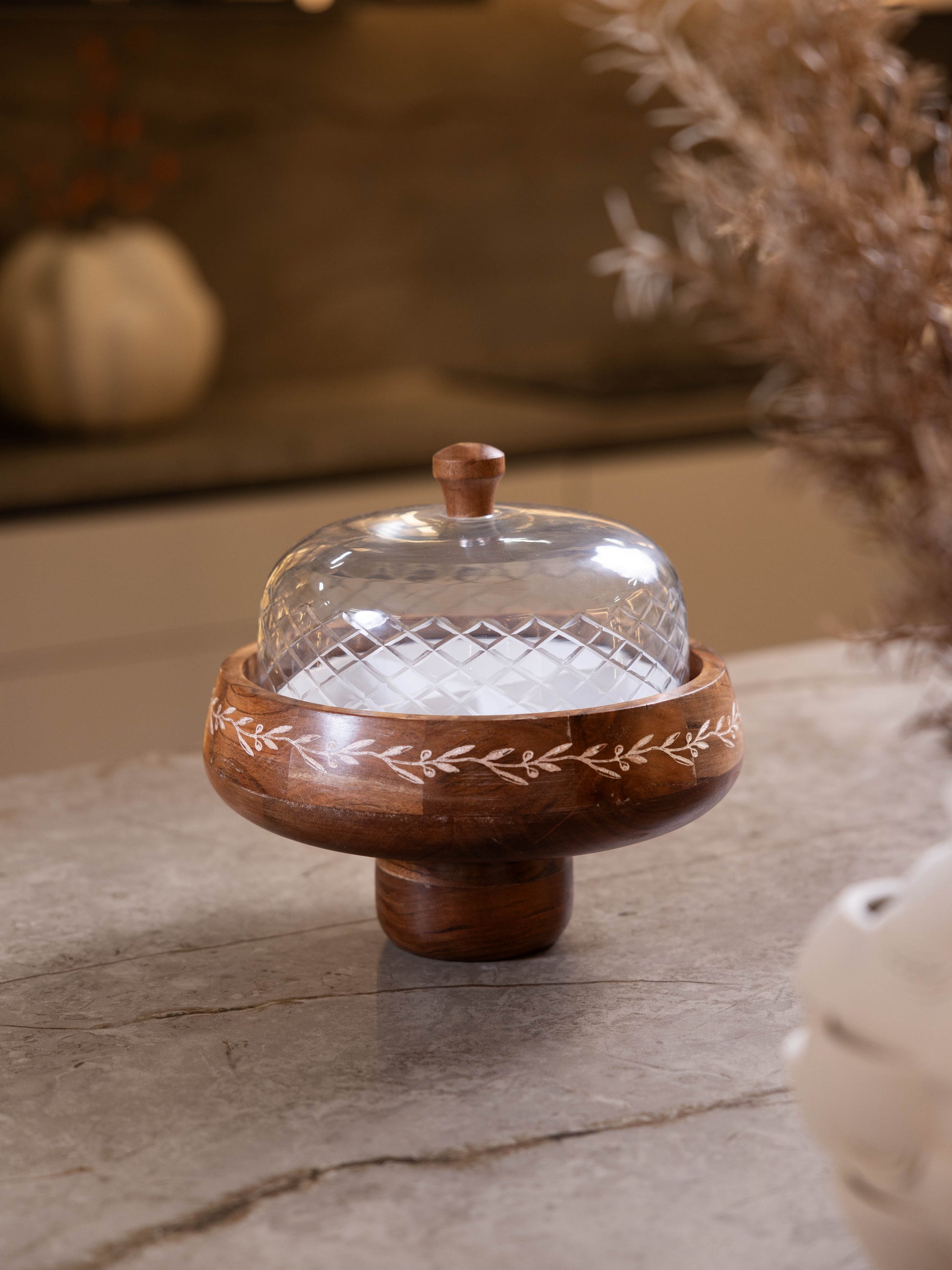 مضيفة كيك بغطاء زجاجي وقاعدة خشبية