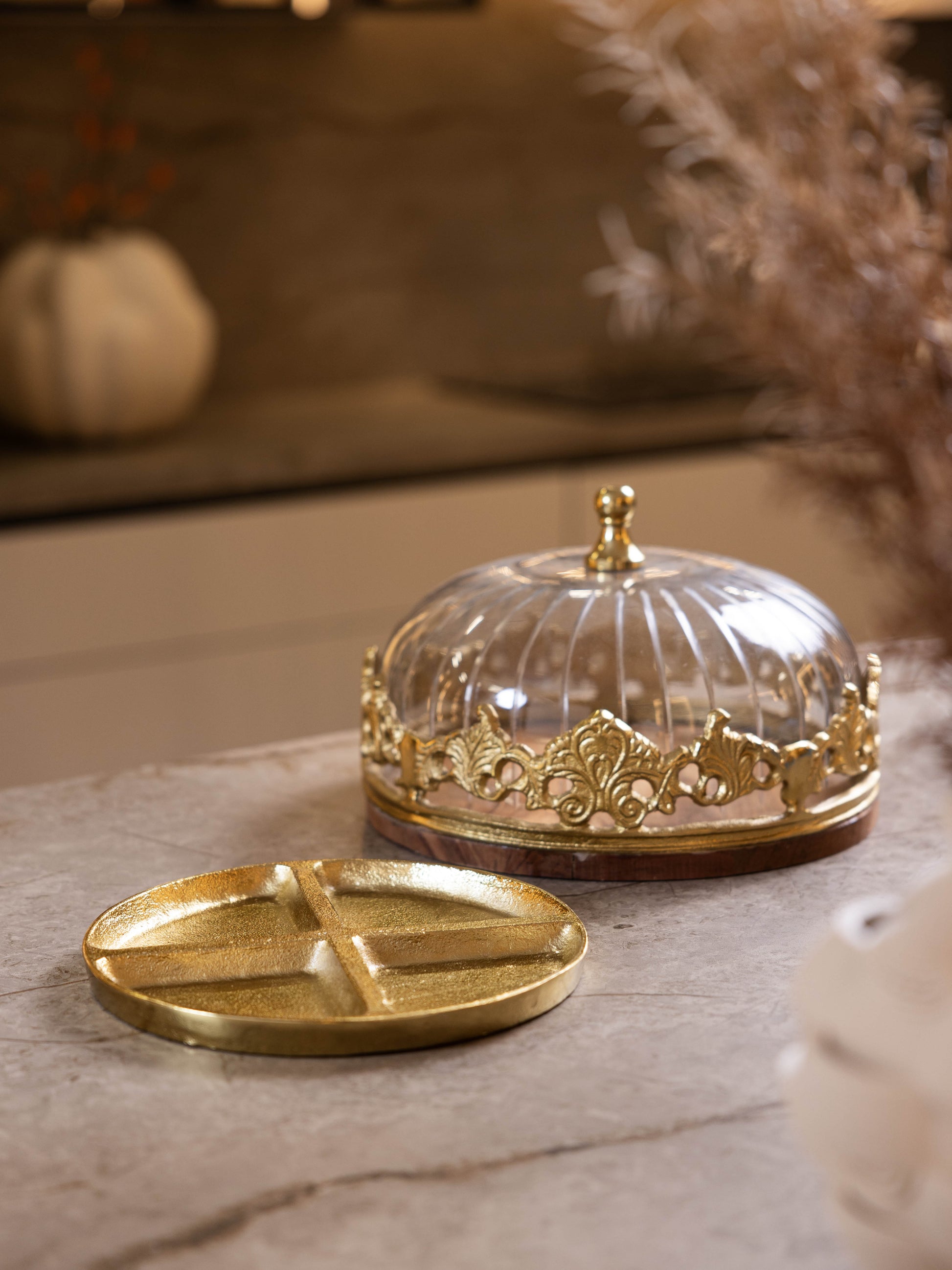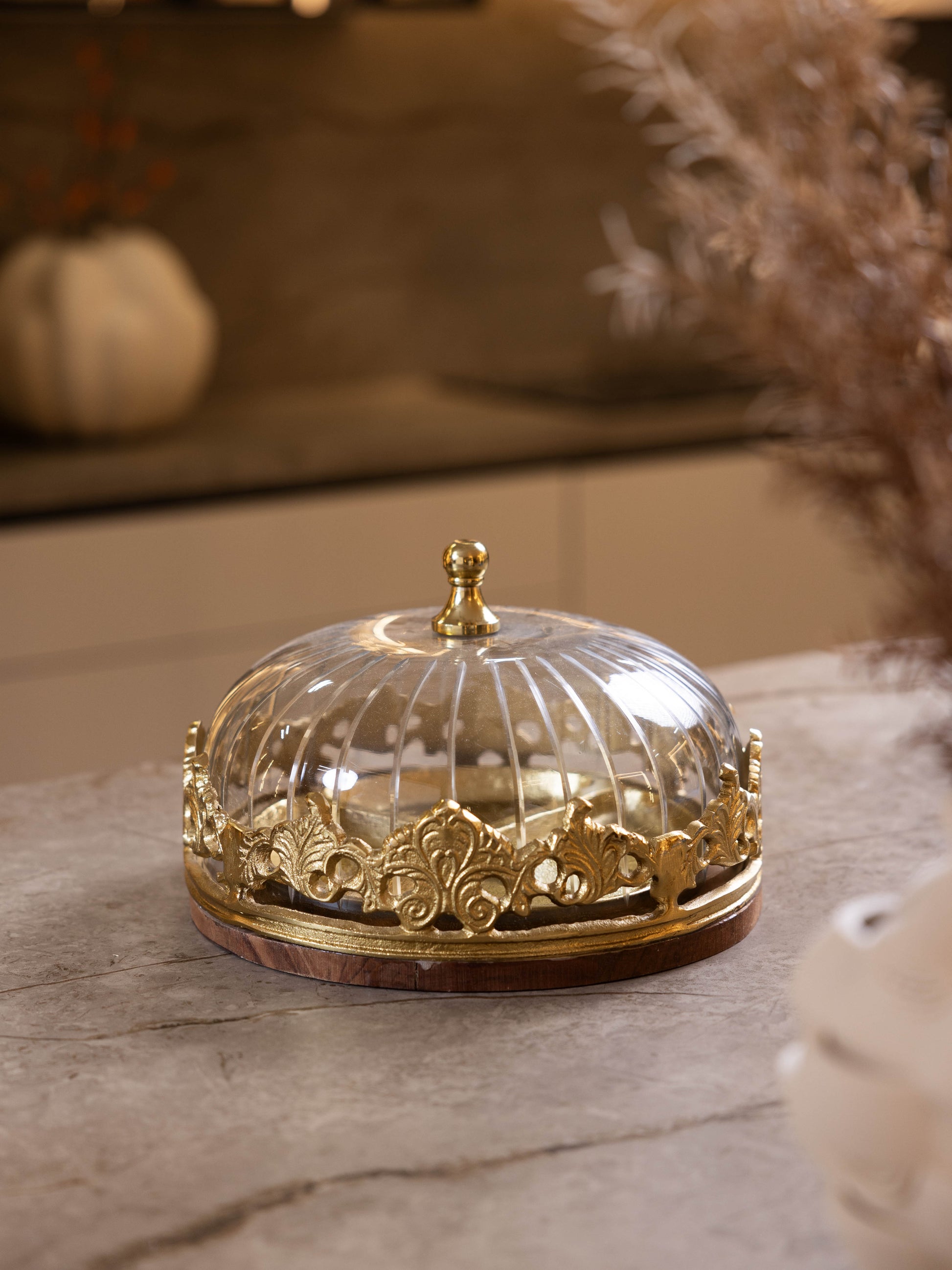 مضيفة كيك بغطاء زجاجي وقاعدة خشبية