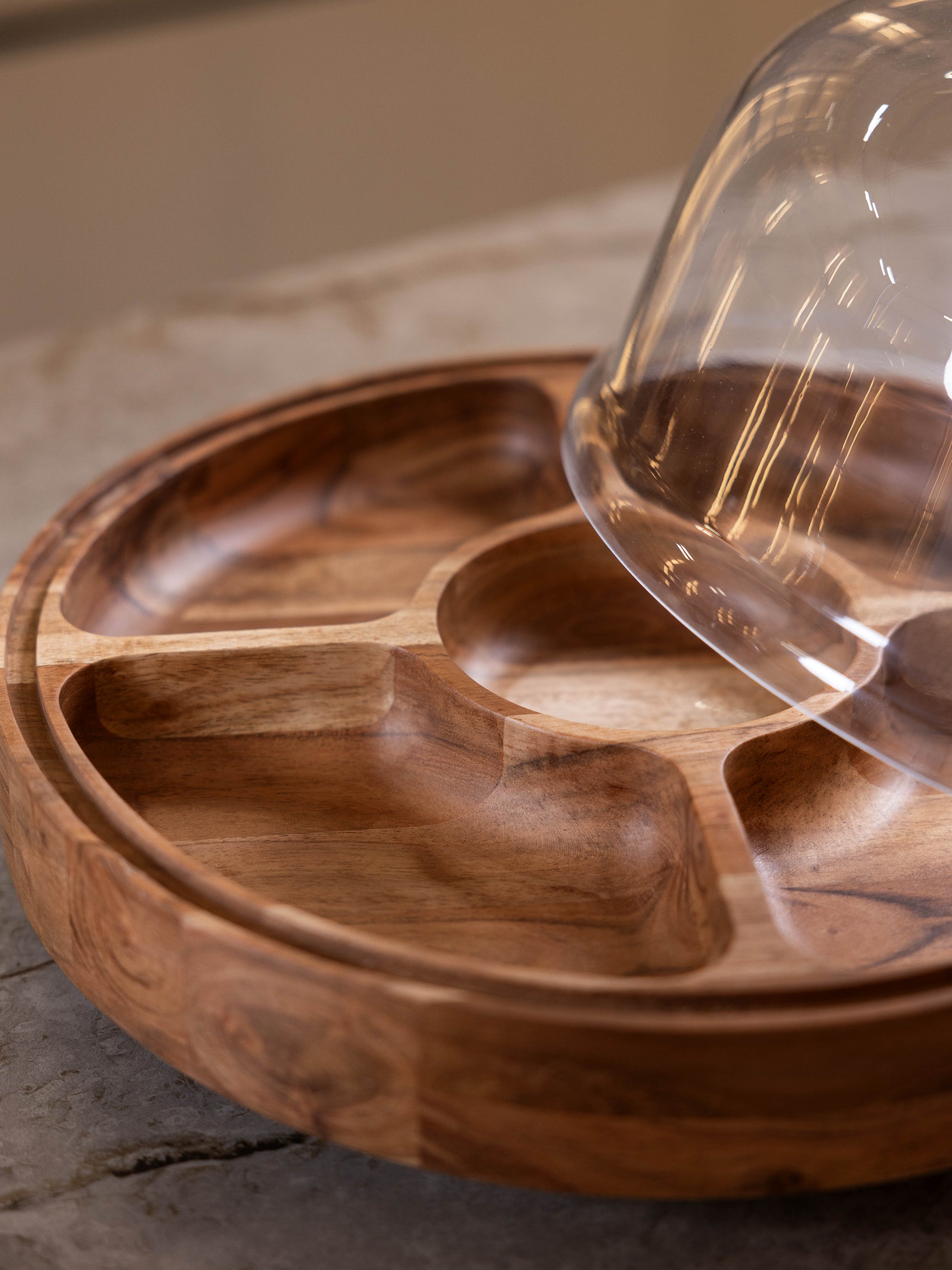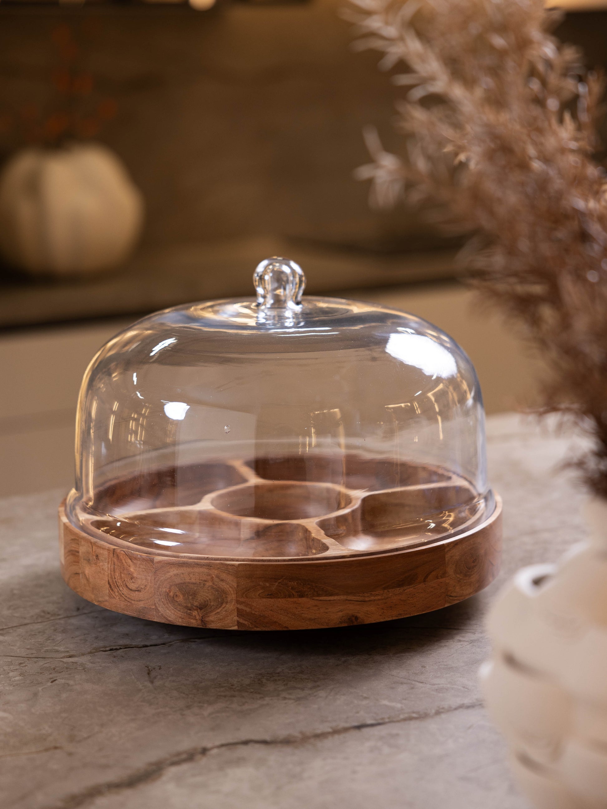 مضيفة حلويات بغطاء زجاجي وقاعدة خشبية متحركة , بأربع أقسام