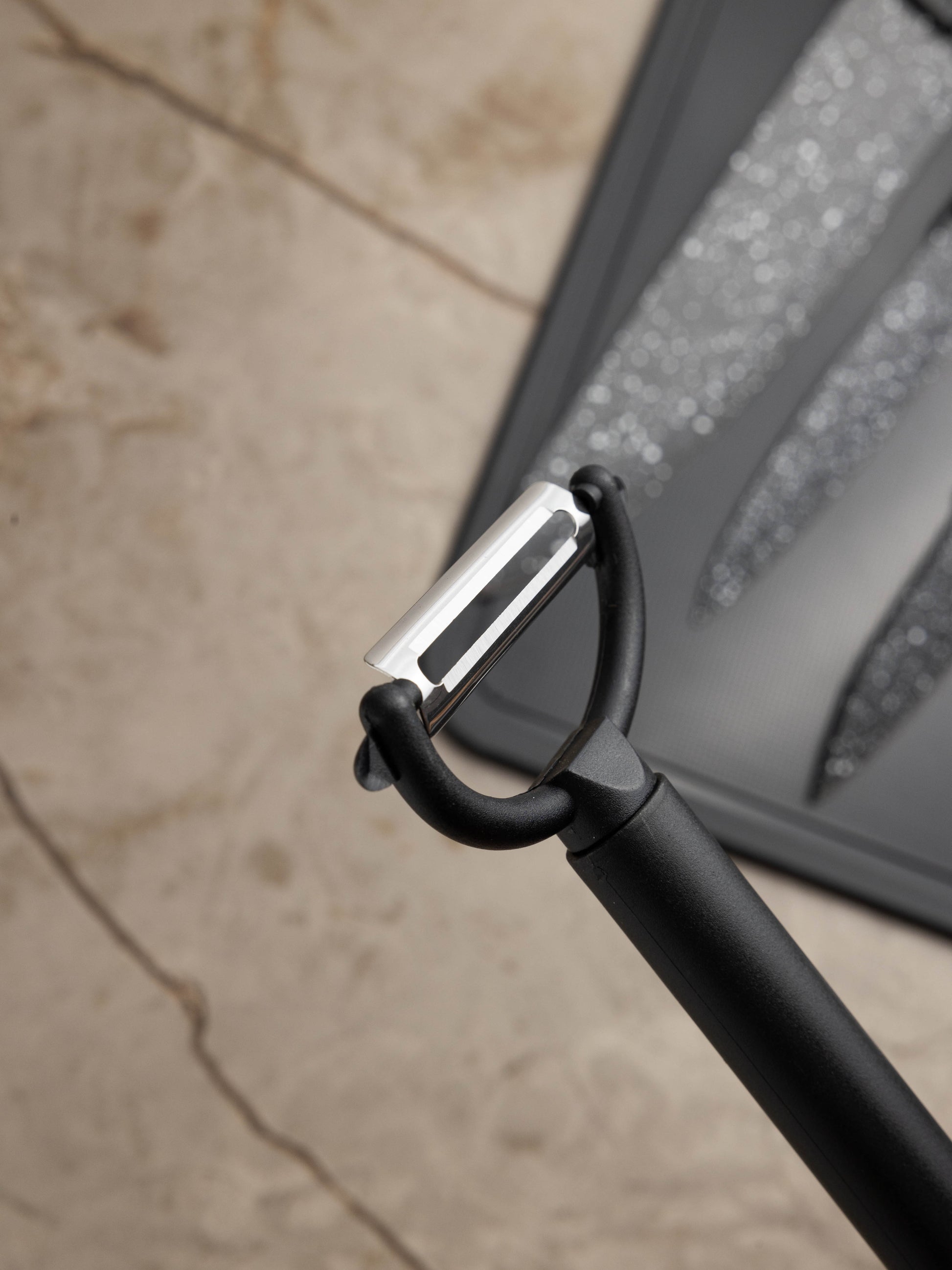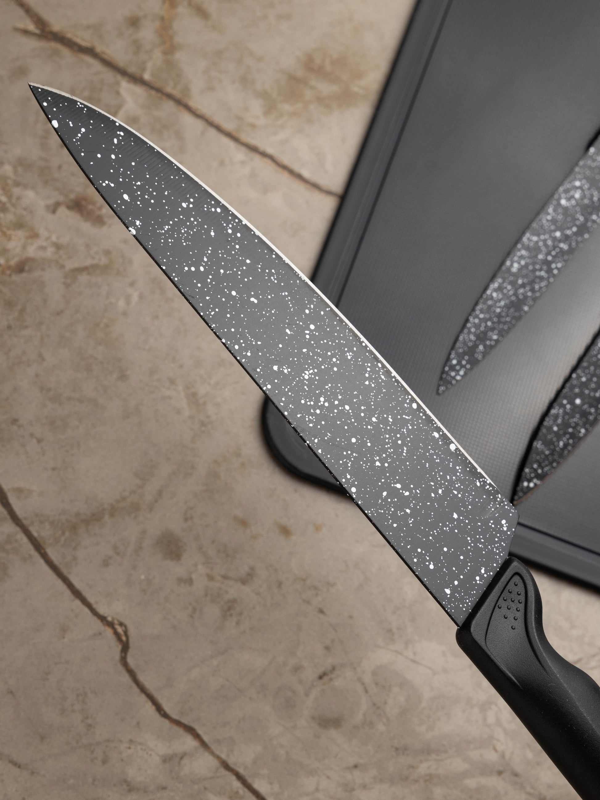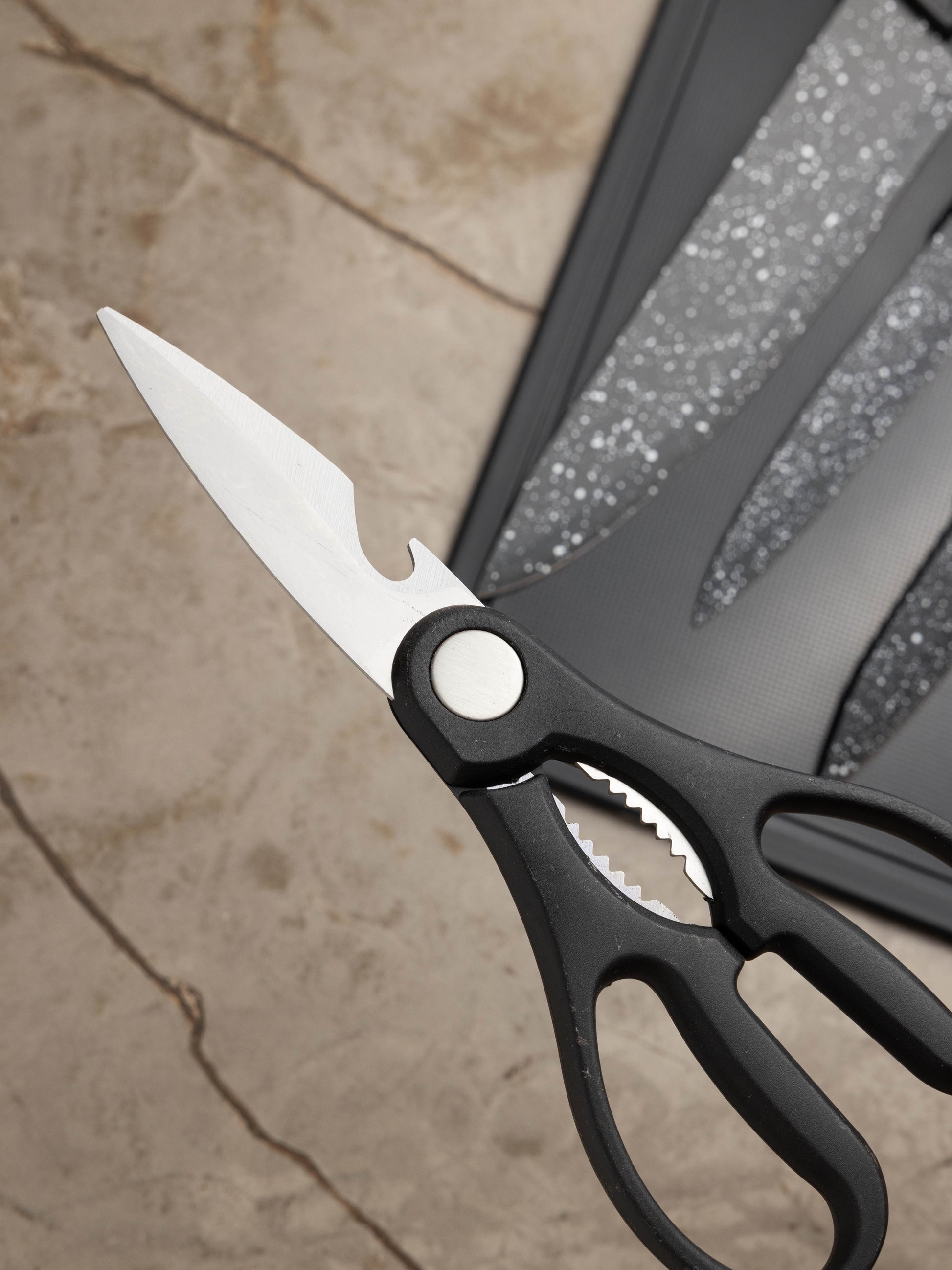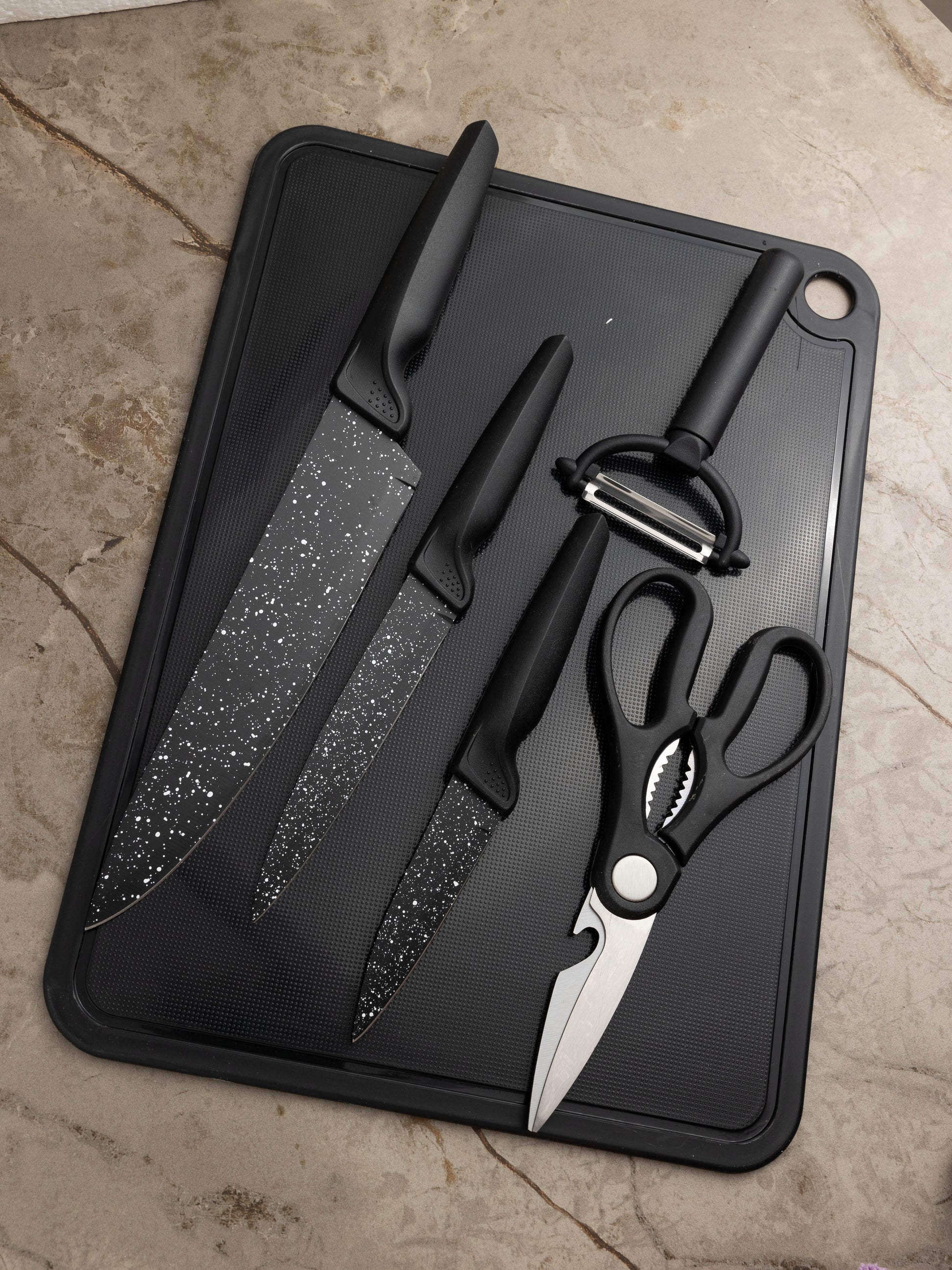 يتكون الطقم من مفرمة + قشارة خضار + مقص مطبخ + 3 سكاكين بمقاسات