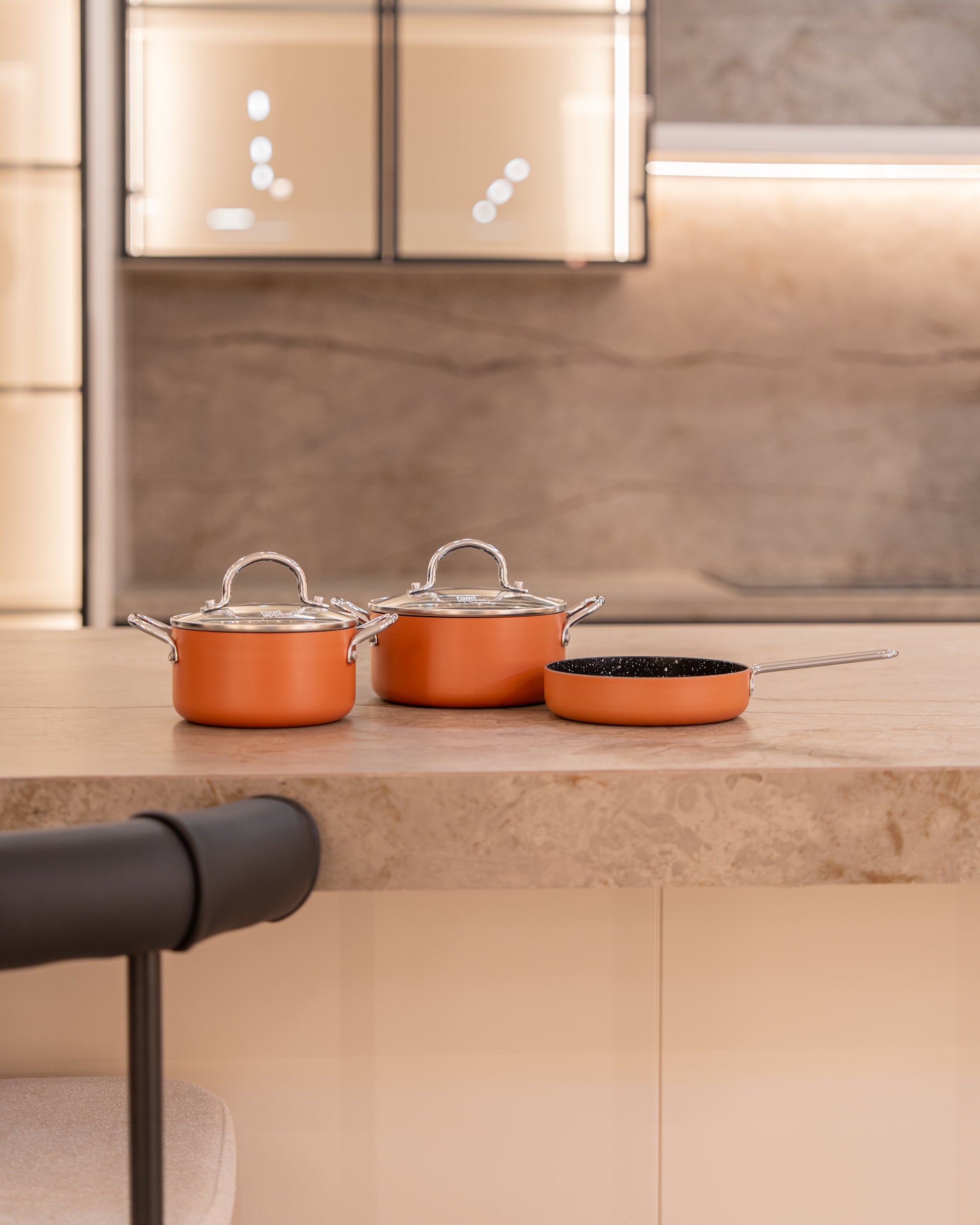 طقم مكون من طنجرتين + مقلاة , يجمع بين التصميم
