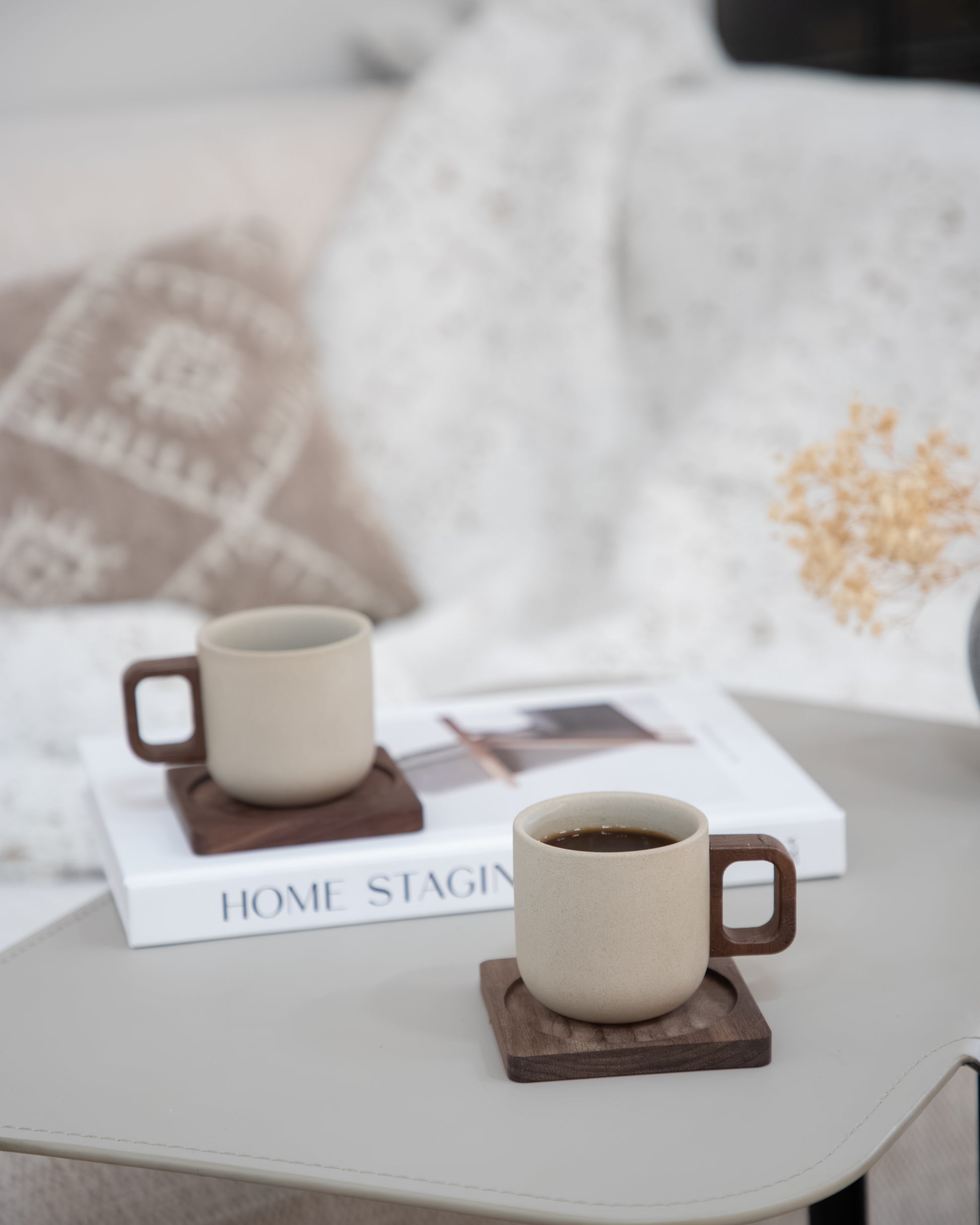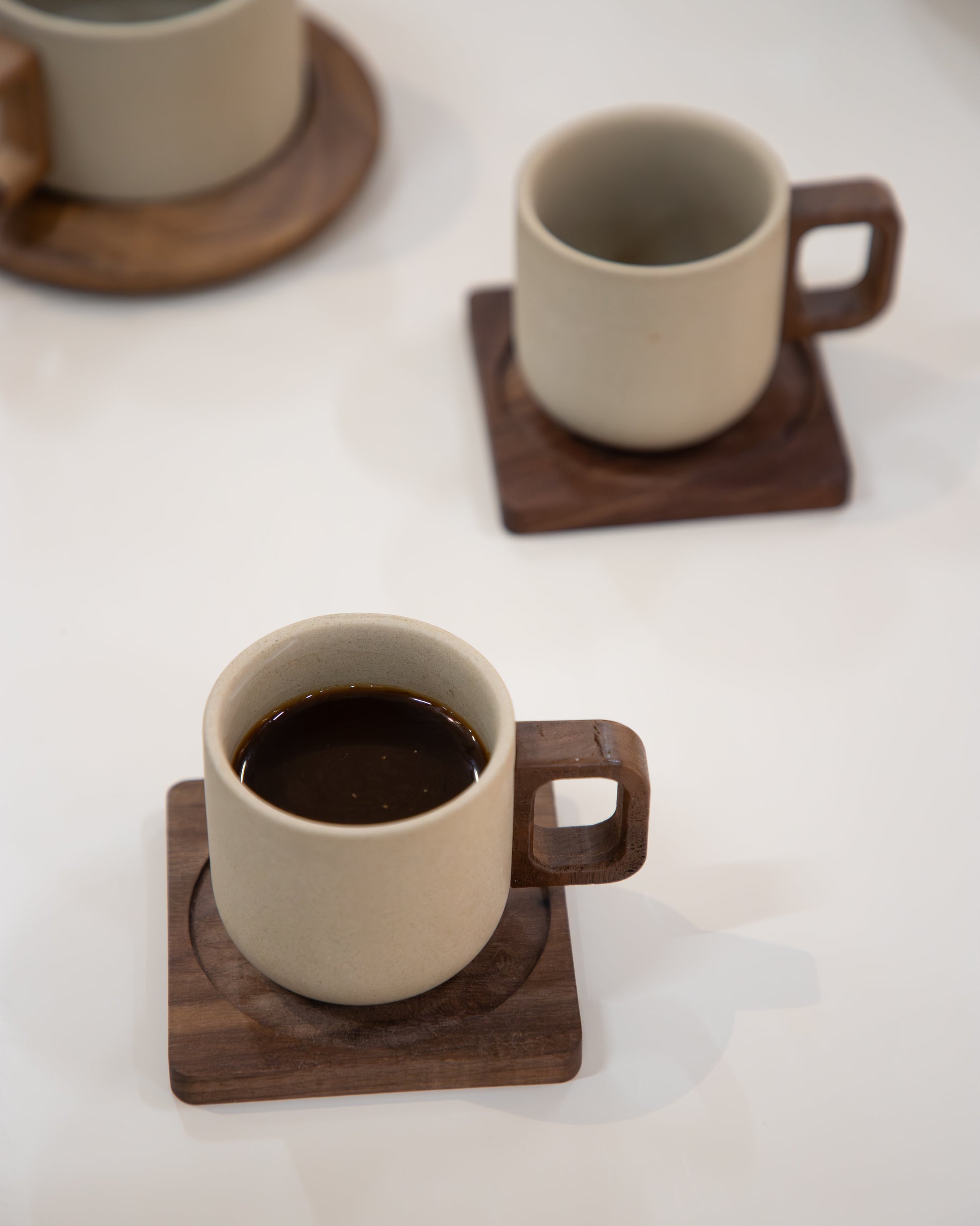 فناجين قهوة مع كوستر خشب بتصميم مميز